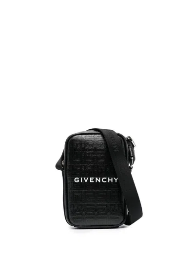 This bag features a jet black cotton exterior adorned with the signature 4G motif logo printed on the front. It includes an all-around zip closure and an adjustable shoulder strap for convenience. The dimensions are as follows: depth of 4.0 centimeters, height of 17.5 centimeters, strap length of 52.0 centimeters, and width of 11.0 centimeters.
