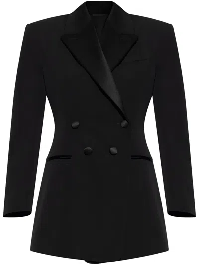 Prominent shoulders and a pleated back shape the exaggerated hourglass silhouette of this double-breasted smoking jacket tailored from fine wool. Double-breasted button closure Peaked lapels Four-button cuffs Chest welt pocket; front welt pockets Lined 100% wool Dry clean Made in Italy Designer Clothing