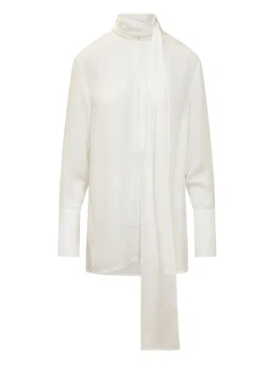 White blouse with long sleeves. Cuffs with buttons. All-over logo. Scarf at the neck. Button closure. Composition: 100% Silk