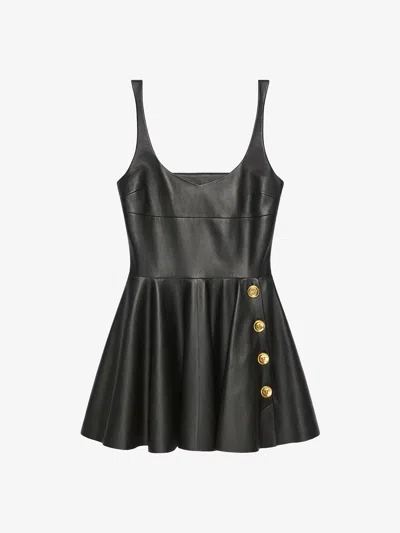 - Short dress in nappa leather. - Scoop neckline. - Twisted straps. - Golden 4G engraved buttons on the skirt. - Invisible zipped closure on the side. - Fitted at the waist and pleated skirt.