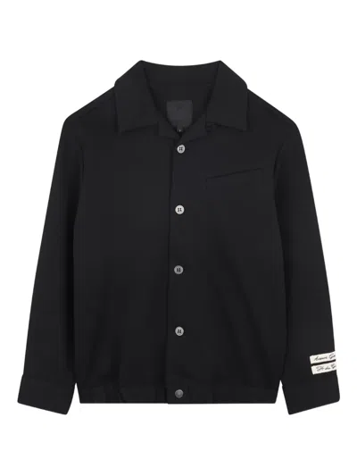 black front button fastening chest welt pocket long sleeves camp collar contrasting logo patch