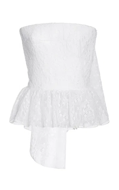 A flounced hem and floaty cape-like back bring dramatic volume to this bustier top cut from delicate French lace in a lily-of-the-valley motif. Hidden side-zip closure Strapless Lined 59% viscose, 41% polyamide with 100% polyamide contrast Dry clean Made in France Designer Clothing