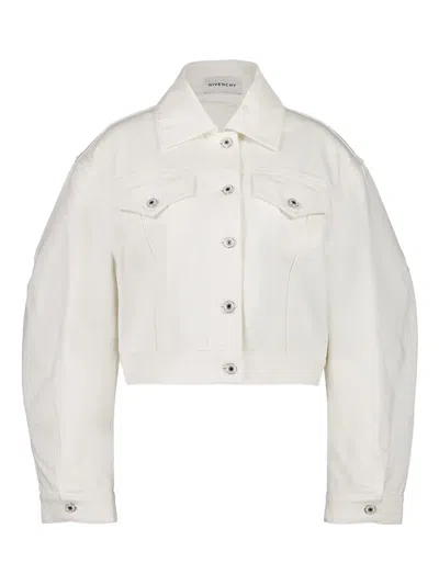 Givenchy cocoon denim jacket featuring curved sleeves and a logo suede back patch Point collar; button front Long sleeves; button cuffs Buttonflap pockets Hip welt pockets Straight fit Hip length Buttontab hem Cotton Made in Italy