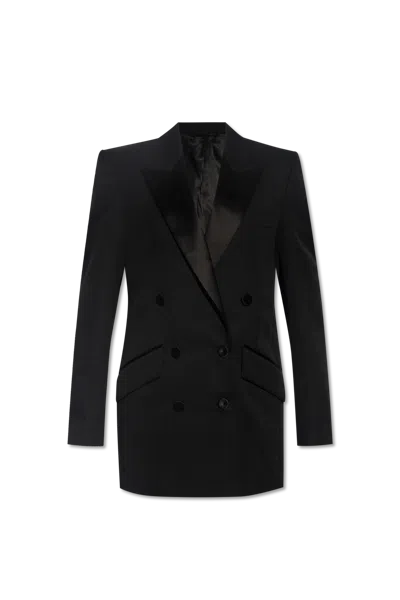 Black blazer from Givenchy. Made from a wool and mohair blend with adouble-breasted silhouette, this style features a double back vent,button fastenings, peak lapels with satin trim, one welt pocket, twoflapped pockets, padded shoulders and long sleeves with button cuffs.
