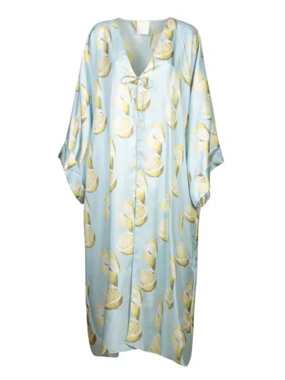 Long silk kaftan with lemon print. V-neck with decorative laces. Wide kimono-style sleeves.. This elegant Givenchy kaftan captures the essence of summer with its vibrant lemon print on light silk, enhanced by a delicate front lacing and fluttering sleeves that add a touch of grace.