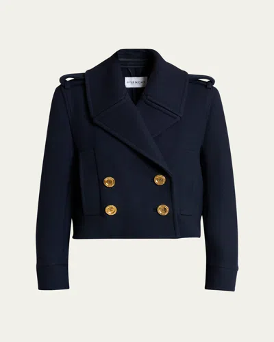 This short peacoat by Givenchy is crafted from wool and finished with logoengraved golden buttons Exaggerated lapels; doublebreasted front Shoulder epaulets Long sleeves Sideentry pockets Relaxed fit Hip length Wool Lining: Viscose Made in Italy