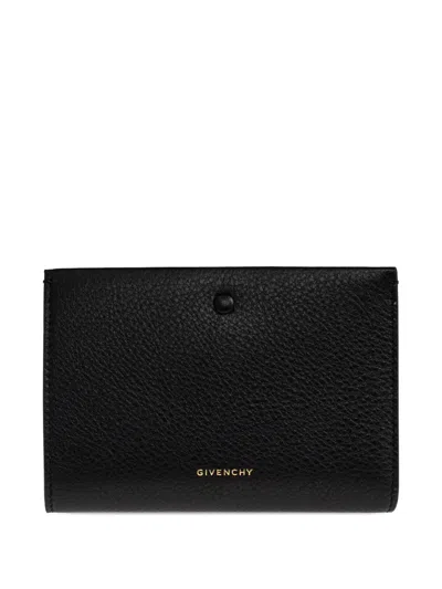 black grain finish interior compartments gold-tone logo lettering press-button closure