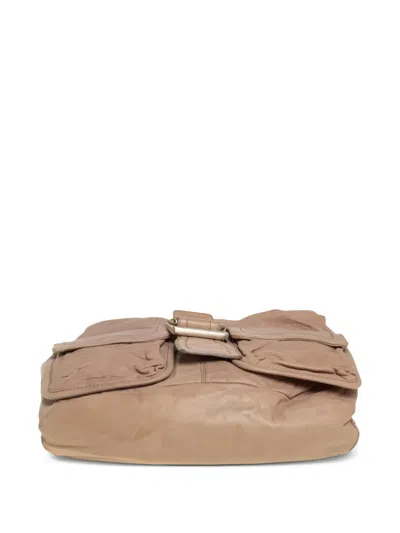 sand beige calf leather adjustable shoulder strap foldover top magnetic strap fastening decorative buckle detail two front flap pockets main compartment internal zip-fastening pocket internal patch pockets full lining Condition: GOOD. This previously owned and used item is in good condition with minimal signs of use. This may include fading of material or plating and scratches.