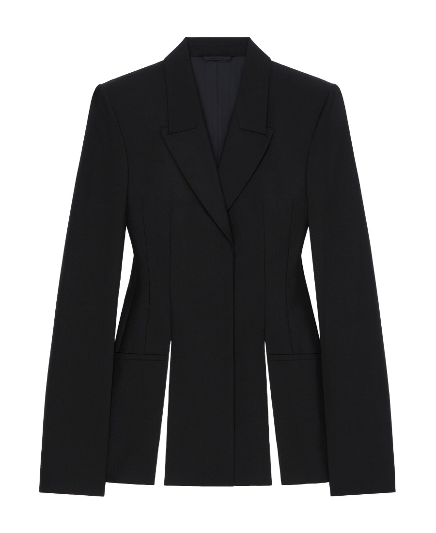 Logo suit jacket A clean coat of wool and mohair Cascading effect pointed collar Hem slit, with pleating and wear effect, impact color mulberry silk georgette yarn Invisible button opening and closing Two flanged pockets on the side 4G LOGO pattern homologous color matching lining