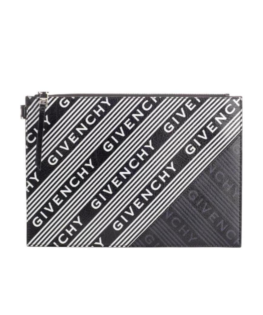 Black and white medium striped handbag, silver metal zipper, leather zipper head, Logo logo, connectable wristband, inside 1 flat pocket.
