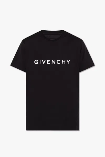 Ribbed crewneck; Short sleeves Contrasting Givenchy Archetype print at front; Small contrasting 4G print at back Straight hem Slim fit Black color 100% Cotton Made in PortugalItem in photo corresponds to a M. Mannequin size: 48 IT. Mannequin measures: Height 1. 85 cm, Bust/Breast 94cm, Waist 75cm, Shoulder 44cm, Neck 43cm, Hip Bone 93cm, Arm lenght 62cm, Breast level 26cm, Knee level 63cm, Wrist circumference 20cm