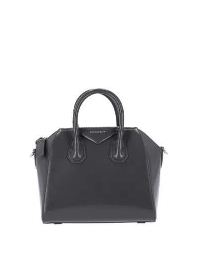 Givenchy antigona mini bag in gray calfskin, dark shade, two top handles, zip closure, adjustable and removable shoulder strap, front metal logo, one internal zip pocket, one main internal compartment.