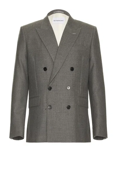 Givenchy Peak Lapel Jacket in Light Grey Melange - Grey. Size 50 (also in 48, 52, 54). Self: 100% wool Lining 1: 100% wool Lining 2: 100% cotton Contrast Fabric: 100% viscose. Dry clean only. Double breasted closure. 3-pocket styling. Faux buttoned cuffs. Interior chest pockets. Midweight suiting fabric with padded shoulders. GIVE-MO234. BM30K61646055. About the designer: Hubert de Givenchy founded his namesake fashion house specializing in Haute Couture and ready-to-wear in 1952. No sooner did it open than Givenchy earned a reputation for breaking with the fashion codes of its time. Today, the house is synonymous with aristocratic elegance, sensuality and fresh romanticism. Its legacy continues through the modern approach of its newest Creative Director Matthew M. Williams, appointed in June 2020.