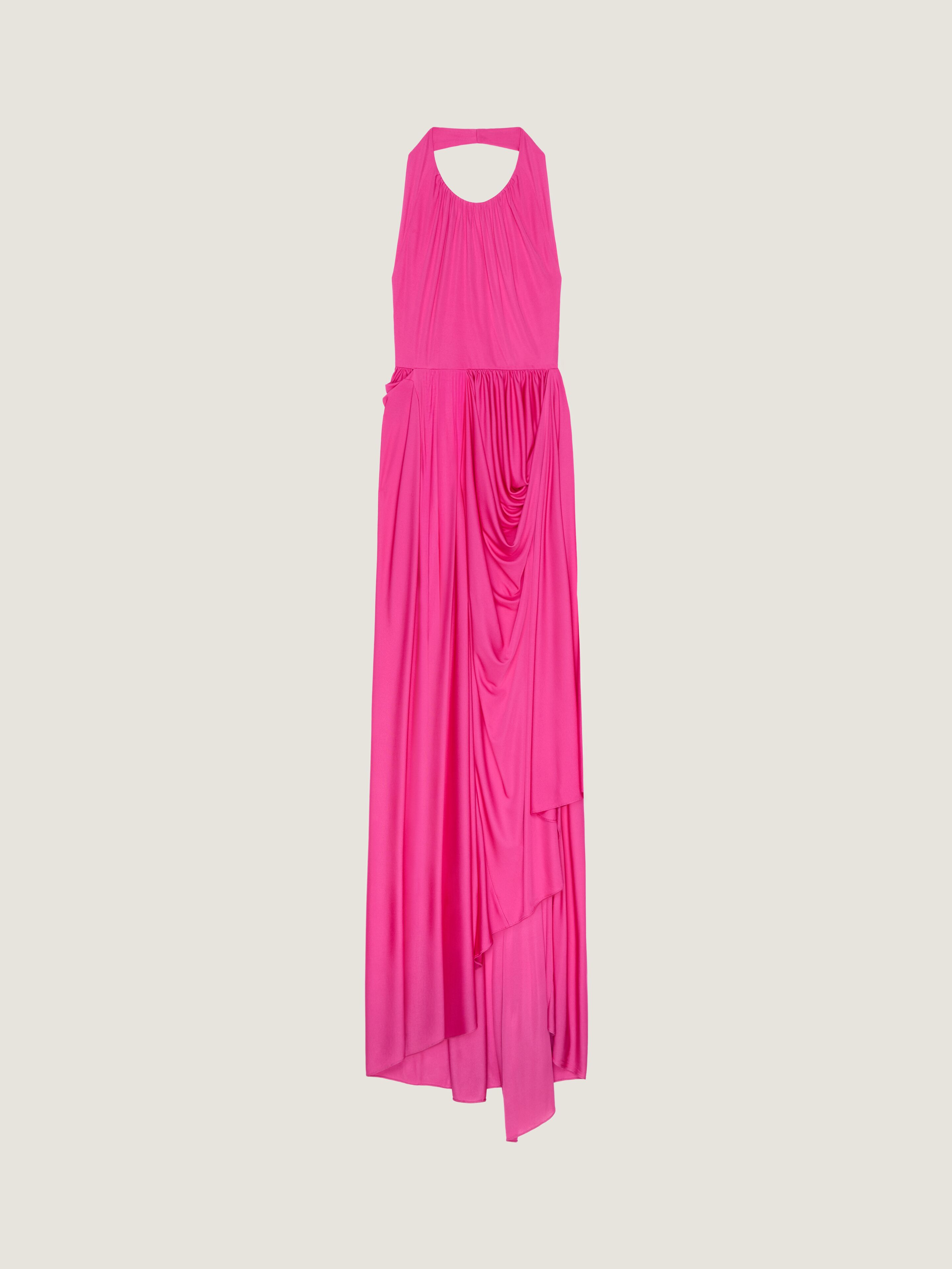 - Long sleeveless dress in jersey. - Halter neck. - Open back. - Draped. - Invisible zipped closure on the side and hook at neck. - Asymmetric length: longer back.