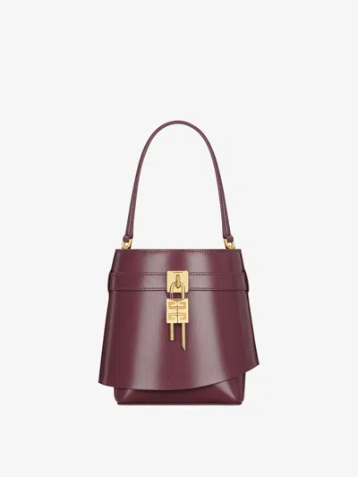 - Bucket bag in Box calfskin leather, to be carried by hand. - Shark Lock line. - Leather handles for comfortable hand carry. - Thin adjustable and removable leather strap offering shoulder or crossbody carrying. - Leather band featuring GIVENCHY metal clasp and 4G padlock. - Golden-finish metal details. - One main compartment. - Canvas lining.