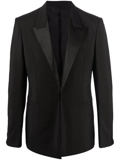 Colou r: Black Satin-Lapel Blazer The model is 1.86m wearing size 48 Features : Virgin wool-mohair blend Peak lapels Magnetic fastening Long sleeves Two front welt pockets Central rear vent Full lining Made in Italy Composition: Outer: Virgin Wool 73% Mohair 27% Lining: Cupro 100% Viscose 72% Silk 28% Care : Dry Clean Only Origin: Italy Sizing: XS S M L XL XXL XXXL XXXXL UK/US 34 36 38 40 42 44 46 48 FR/IT/EU 44 46 48 50 52 54 56 58 JP 1 2 3 4 5 6 7 8 CN 170/88A 175/92A 180/96A 185/100A 190/104A 195/108A 200/112A 205/116A KR 90 95 100 105 110 115 120 125