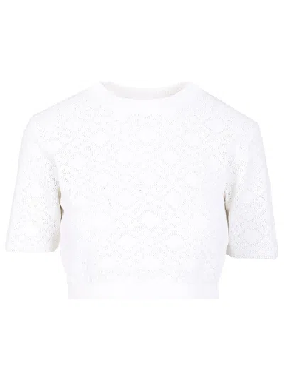 Short-sleeved crop sweater. Embroidered texture design. Round neckline.Explore tailored elegance with Givenchy's White Knit Crop Sweater, perfect for a sophisticated, contemporary look. Its intriguing design and exquisite craftsmanship define this iconic piece.