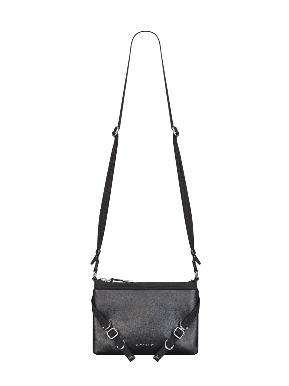Zippered closure, magnetic closure on the front, adjustable shoulder straps.