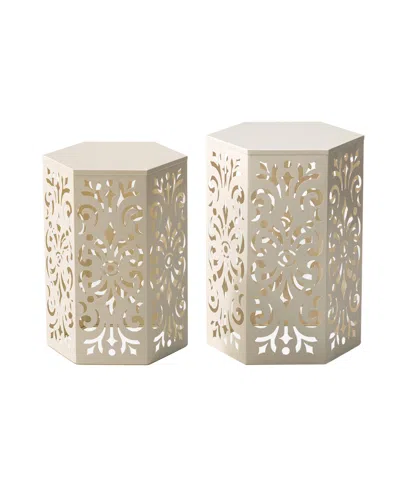 GLITZHOME Multi-functional Set Of 2 White Floral Pattern Hexagonal Garden Stools Or Planter Stand