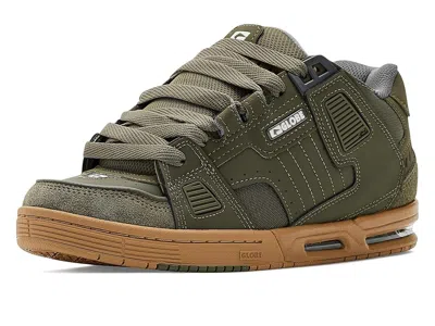 Globe Sabre - Men's Skate Shoes : Moss/Gum : Sharpen up your skill at the skatepark with the durable design and added tech of the Globe Sabre skate shoes. ; Skateboard shoes with leather and synthetic uppers. ; Triple stitched, double layered toecap. ; Molded TPR underlays for ollie protection and added reinforcement. ; Unique lacing system allows multiple lacing options. ; Inner sock construction for a secure and comfortable fit. ; Nitrocel midsole for shock absorption. ; Supportive custom molded rubber outsole with stitch reinforcement and textured sidewall construction for maximum grip. ; HexTrac pattern for superior grip. ; Imported. Measurements: ; Weight: 1 lb 3 oz ; Product measurements were taken using size 7, width D - Medium. Please note that measurements may vary by size. | Globe Sabre Men's Skate Shoes Moss/Gum : 9 D - Medium, Leather/Synthetic