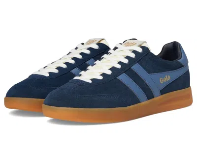 Gola Cyclone - Men's Snow Shoes : Navy/Moonlight/Gum : The Gola Cyclone Sneakers is designed in a more contemporary look and stands out with its dark gum cup sole. The low-top sneakers is crafted with a leather upper with signature side stripe detail, breathable leather lining, and a rubber insole. The contrasting lace-up closure ensures a secure fit and the brand logo detail at the side panel adds an authentic touch. ; Round toe shape. ; Rubber outsole. ; Imported. | Gola Cyclone Men's Snow Shoes Navy/Moonlight/Gum : 8 D - Medium, Leather