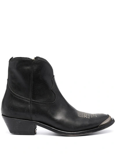 Black leather Young ankle boots from Golden Goose featuring embroidered design, metal toecap, almond toe, ankle-length, side zip fastening, Cuban heel and leather sole.
