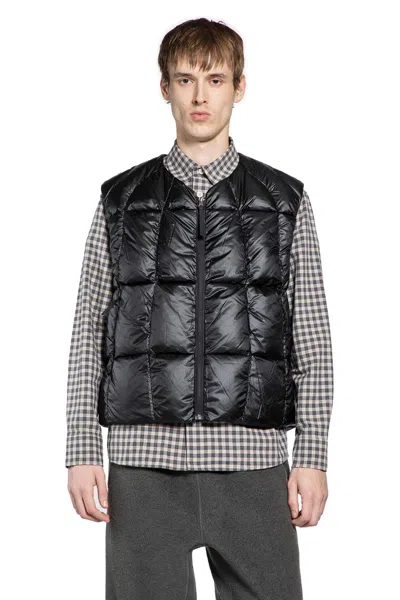 A technical black down vest engineered with Goldwin s mastery of performance and minimalist precision. This vest balances technical rigor and understated style, perfect for layering or as a sleek, modern outer layer in any urban or alpine environment.blackpadded quiltingPertex Quantum ripstopwater-repellentv-neckzip closurefront signature spur line curveside zipped pocketssleeveless