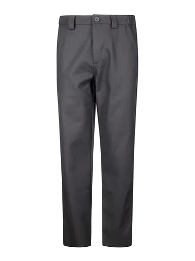 Trousers with elastic belt on the hips, chino pockets, straight leg, regular fit.
