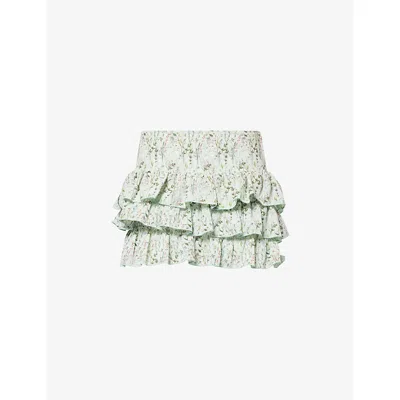 GraceJacob woven mini skirt100% viscoseRegular fit, mid-rise, wide waistband, tiered ruffled hem, all-over floral printHand washTrue to sizeModel is 5ft 10in/1.78m and wears a size smallLightweight, non-stretch