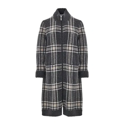 Cappotto in Boucle Jacquard in Grigio con Maxi Zip Gran Sasso. In check grigio/beige, allacciatura frontale con maxi zip, colletto a lupetto a costine, due tasche frontali applicate, sul fondo e sui polsini lavorazione in maglia a costine. Composizione: 87% Lana, 8% Poliammide, 5% CashmerSKU Interno: 25DIC36SKU Brand: A20235924124041098
