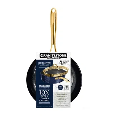 GRANITESTONE CHARLESTON COLLECTION: Drawing inspiration from Southern living, this cookware melds timeless elegance with modern functionality. Not only does it suit both contemporary and traditional kitchens with its universal charm, but it also offers exceptional nonstick performance and unparalleled functionality. 4 QUART SAUTE PAN: A nonstick 12-inch pan that will become your go-to for meal prep and busy weeknights. Made to last 10x longer and handle the ins and outs of everyday use, this durable pan is dishwasher safe and oven safe up to 500ËF. The hammered, modern farmhouse design adds a stylish component to this durable cookware piece. ULTRA NONSTICK SURFACE: Easy on, easy off with an interior that prevents food from sticking. Little to no oil or butter is needed to cook, plus it's made without PFOA, PFOS, lead, or cadmium so it's healthier for you and your family. 10X LONGER LASTING: 3 heavy-duty layers crafted with forged aluminum construction feature a remarkably durable coating that's scratch-resistant and metal-utensil safe. Built to last 10x longer than conventional coatings and made to stand up to all your cooking tasks. EFFORTLESS CLEANING: Food won't stick to the surface when properly used on low and medium heat. No need for scrubbing. Just wipe the nonstick surface with a paper towel and you're set for the next time! DISHWASHER SAFE: Save more time after cooking, especially during busy weeknights. Once you're done, just place your cookware into the dishwasher and let it do all the cleaning. OVEN SAFE UP TO 500ËF: Finish your cooking in the oven. Fry pan is compatible with induction, gas, halogen, ceramic, and electric stovetops. DEEPER THAN AVERAGE: Crafted to be deeper than traditional pans, these are designed to hold more ingredients. Whether you're cooking for a large family or looking to have leftovers, this pan is a must-have. EASY TO HANDLE: Easy to lift and move around, from stovetop to oven to table, yet sturdy enough to handle all your cooking needs. Gold ergonomic handles stay cool to the touch to offer maximum comfort while cooking.# Pieces In Set: 2Included: 1 4 Qt. Saute Pan(s) With Lid(s)Features: Non-Stick, Pfoa Free, Heat Resistant Handle, Oven Safe, Dishwasher Safe, Scratch Resistant, Induction Safe, Even HeatingCooktop Compatibility: Induction, Ceramic, Electric, GasRecommended Utensil Material: Nylon, Metal, SiliconeMaximum Temp (f): 500 Degrees FCare: Dishwasher Safe, Hand WashDecor Styles: ContemporaryMaterial: AluminumCountry of Origin: Imported