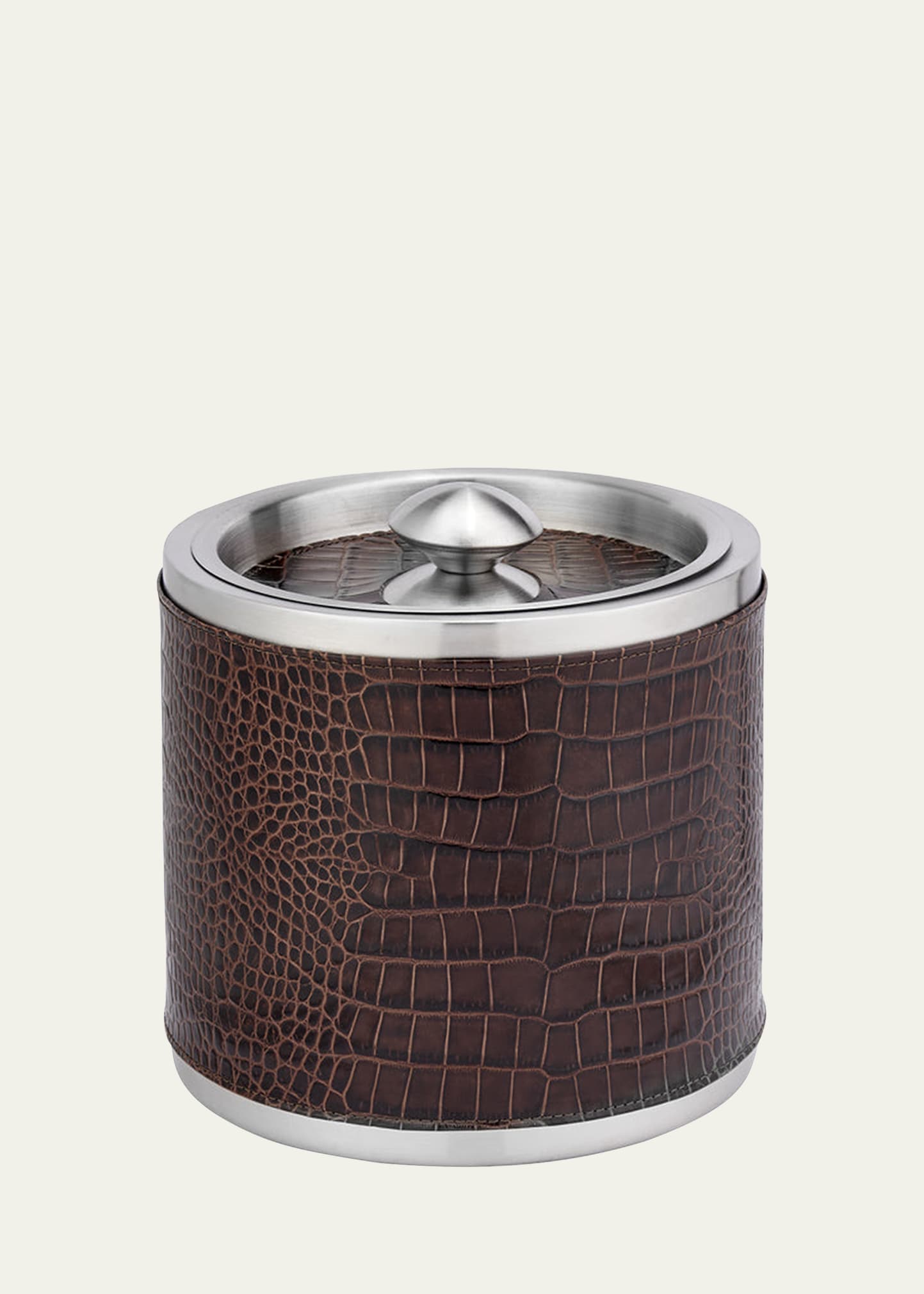 Ice bucket wrapped in croc-embossed leather. Includes ice tongs. Made in the USA of Italian materials.