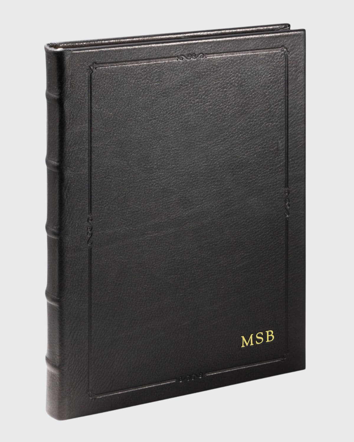 Journal is made of a hard manuscript leather cover with square corners. Personalization is one to three initials in style and color shown. Smyth-sewn for strength and longevity. Lined paper with glit edges. Double-faced cream satin ribbon marker. Approx. 7"L x 9.5"T x 1.5"W. Made in the USA of imported materials.