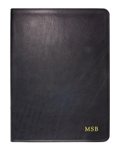 Journal is made of a flexible leather cover with rounded corners and smyth-sewn bindings. Personalization is one to three initials in style and color shown. Lined, cream-white paper with glit edges. Double-faced cream satin ribbon marker. Approx. 7"L x 9.5"T x 1.5"W. Made in the USA of imported materials.