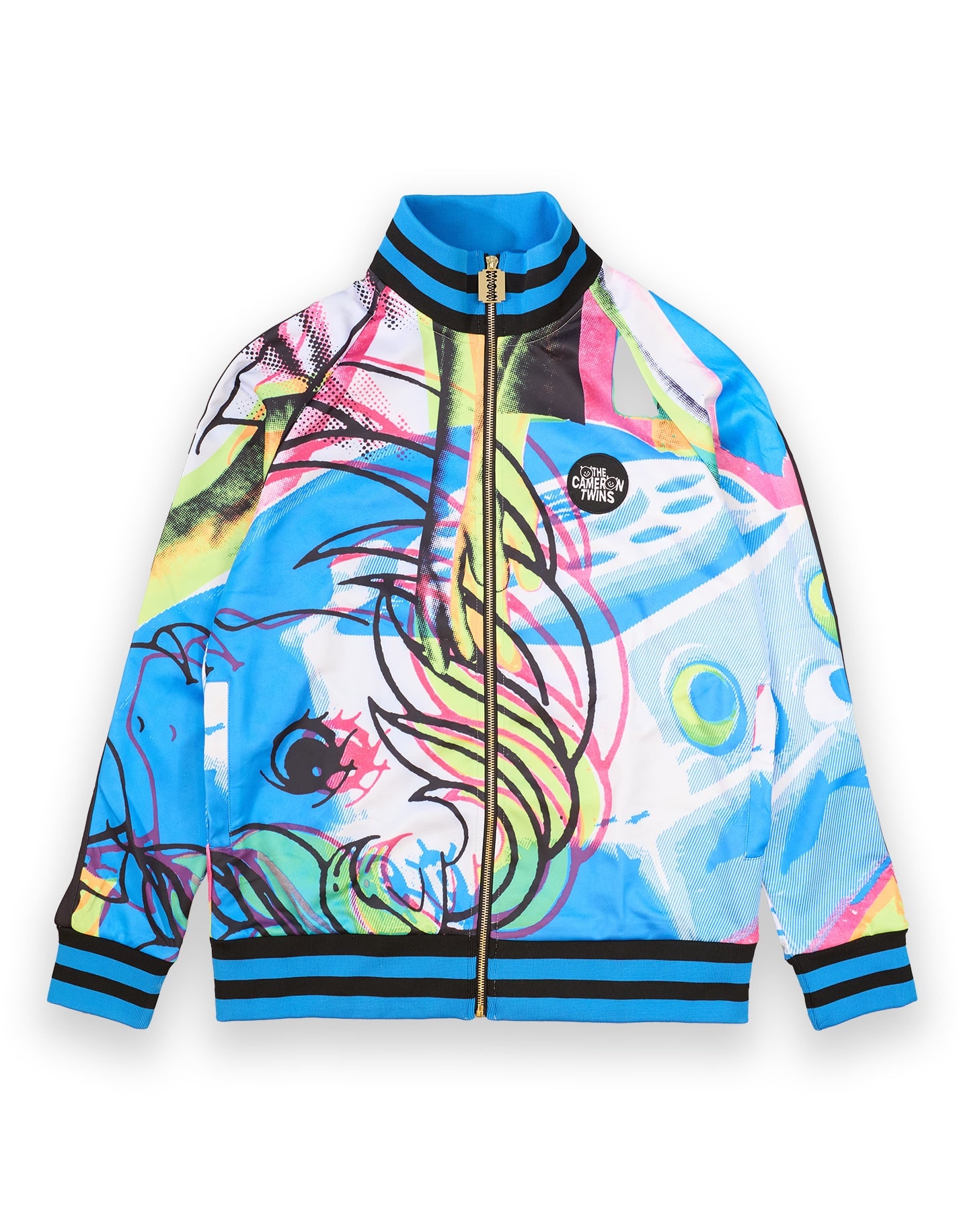 Introducing "Retrovison" - a unisex tracksuit that dials up the charm for everyone! This piece is the epitome of art meets street. The stylised graffiti print features a whimsical toy phone surrounded by splashes of blue, yellow, and pink. A gold zip and bold blue and black ribbing complete the look, making this set a standout whether you’re lounging or out and about. It’s bold, it's fun, it’s fashion with a wink! Please Note: The main photoshoot images were taken using initial samples of this tracksuit. The final design features a Cameron Twins logo badge and a gold razor zip, as shown in the close-up images. 100% Polyester Machine wash at 30°C, Do not tumble dry