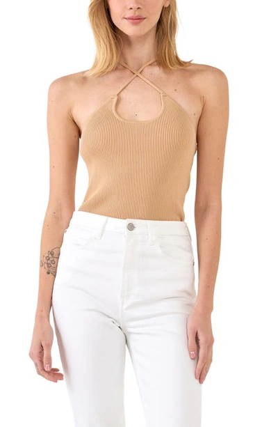 A crossover halter neckline highlights your collarbone and shoulders on a curve-hugging tank that's textured with a subtle rib.