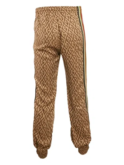Jacquard|-|Fair|Gucci reimagines athleisure in jacquard GG canvas with brown leather trims. These track pants offer tailored comfort with a branded edge, finished with striped sides and elastic hems. Style with a hoodie or crisp tee for elevated off-duty dressing.