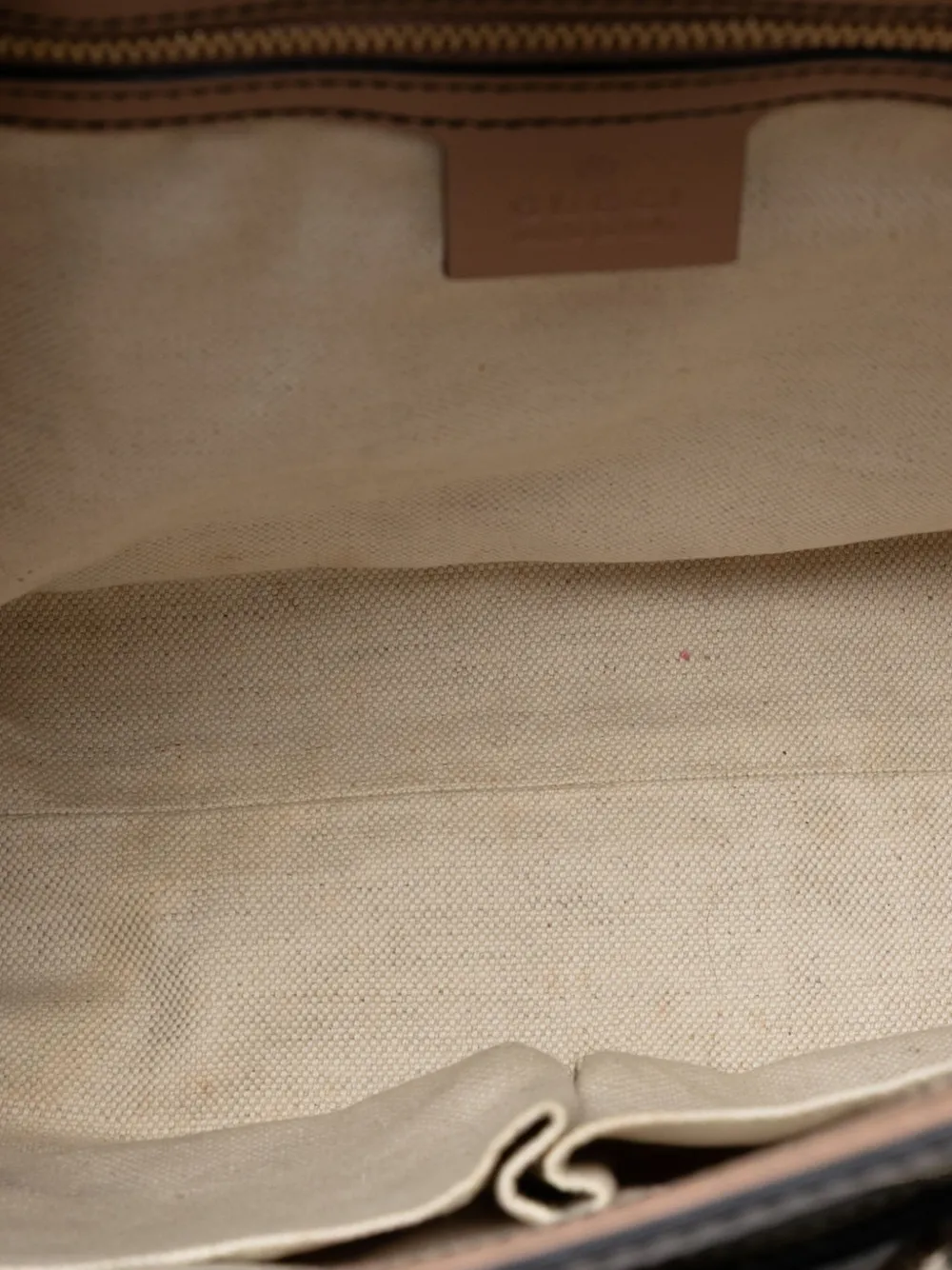 canvas body with leather trim curb chain straps with leather shoulder guards front flap with slip through closure interior zip and open pockets brown Serial Number: 295403 525040 This item has no inclusions. Condition: GOOD. This previously owned and used item is in good condition with minimal signs of use. This may include fading of material or plating and scratches. Declared Damages: Handle/Strap Feature(s) Minor Splitting. Please refer to the photos on this product page for a detailed view of the item, including any damages declared.