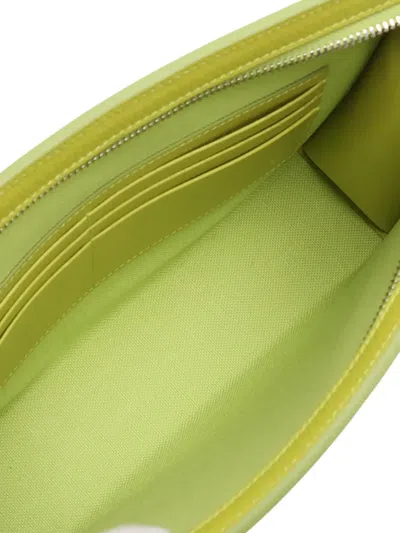 coated canvas body with leather trim detachable flat wrist strap top zip closure interior slip pockets green Serial Number: 768255 This item has no inclusions. Condition: EXCELLENT. This previously owned item is in near-perfect condition with no signs of damage or use. Due to the exclusivity of this item and its limited availability, processing and delivery might take longer than usual. Please refer to the photos on this product page for a detailed view of the item, including any damages declared.
