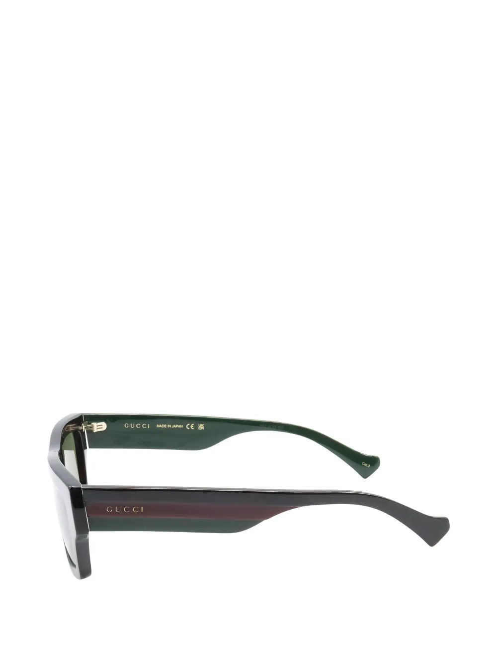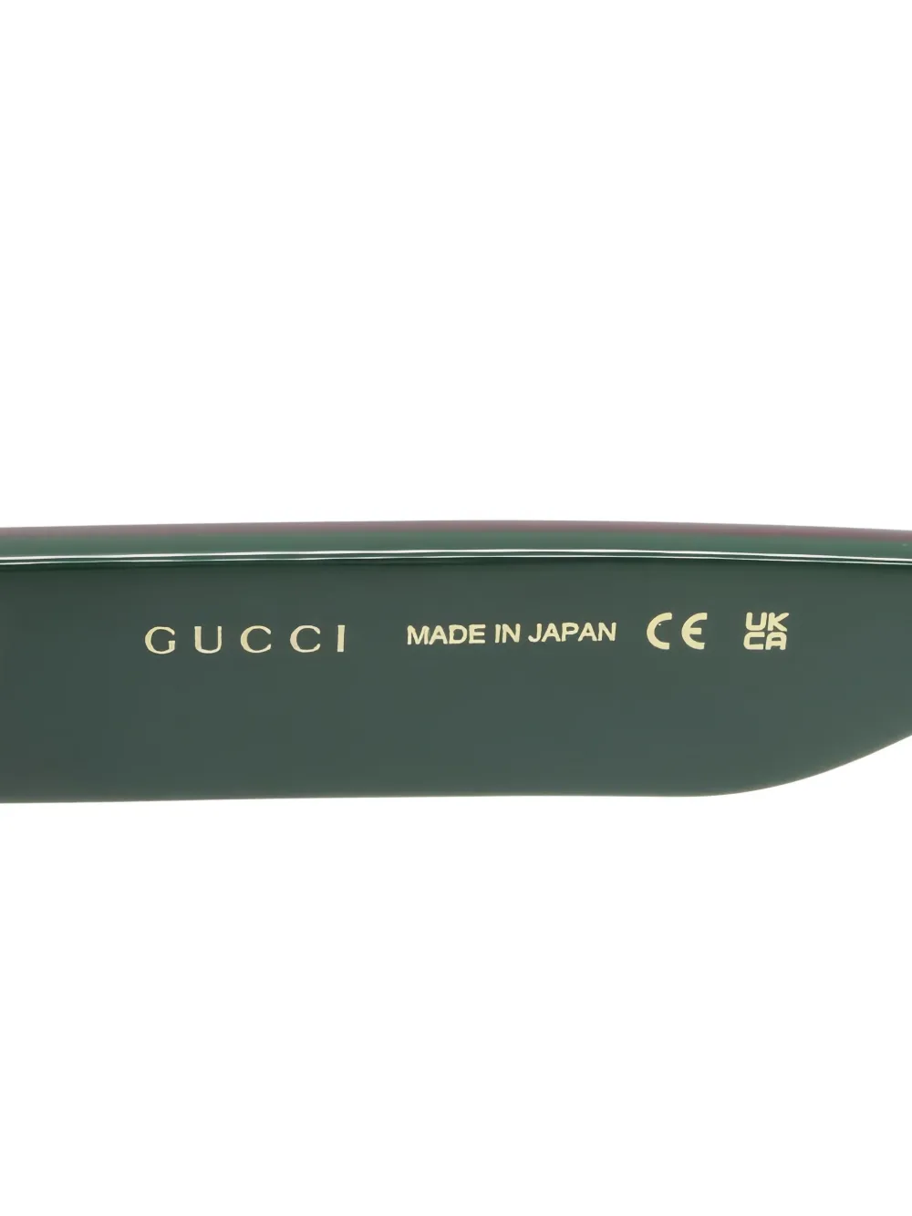 brown rectangle frame green lenses stripe detail logo lettering notable damage