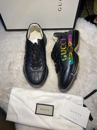 New with box and dust bags authentic gucci rhyton sneakers In black leather. About the size.Please read the detail information.Those sneakers are in men size 6,Which converting to women size fitting is women size EU38-EU38.5.I also measured the outsole and insole as reference. Outsole measurement is 12 inches and insole is 10.5 inches.(So the size inside of the shoe indicate size 6.Which is men size 6 as reference.) Which have been tried on indoor only.So there might be some very slightly sole wear as reference. A mainstay in Gucci athleisure, the Rhyton sneaker embodies '90s vibes and the hip-hop scene with its old-school shape and chunky construction. Buffed leather in midnight black contrasts with the metallic sheen of Gucci in cosmic rainbow. (I have 5 pairs in stock,So I only post the authenticity code for two pairs on the listing as reference due to the pictures quantity limited as reference.)