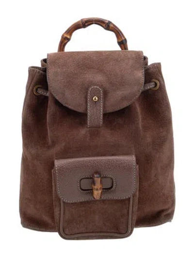 Gucci Backpack Brown Suede Bamboo Accent Gold-Tone Hardware Leather Trim Bamboo Handle & Dual Adjustable Shoulder Straps Leather Trim Embellishment & Single Exterior Pocket Canvas Lining & Single Interior Pocket Turn-Lock Closure at Front & Drawstring Closure at Top | Gucci Bamboo Backpack Mini in Brown