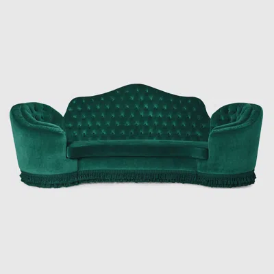 Inspired by 18th century designs, the camelback silhouette is characterized by an arched back and defined lines. This interpretation of the sofa is presented in green velvet and further elevated by capitonnè stitching. Green velvet, Beechwood and poplar structure, Fringe trim, Capitonné stitched upholstery, Capitonné stitched upholstery, Camelback shape, Seats three, 110"W x 47"H x 43.3"D, 100% trevira cs velvet, Made in Italy, This Made to Order item is final sale and cannot be returned or exchanged. Once placed, orders cannot be canceled. Estimated delivery time: 4-5 months. Please note, gift wrapping is not available for this item.