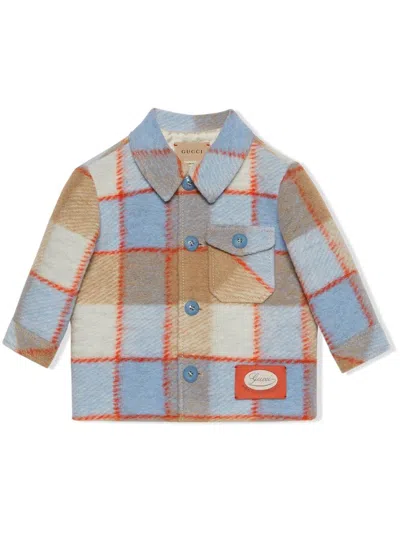 check-pattern wool jacket from GUCCI KIDS featuring wool, check pattern, logo patch to the front, classic collar, button-fastening chest pocket, front button fastening, long sleeves, straight hem and baby blue/ multicolour.
