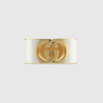 Enamel rings are introduced as part of the Gucci Interlocking selection with a contemporary cut-out formation. Echoing the ready-to-wear color palette transitioning into Pre-Fall 2025, this variation appears in white. Brass with yellow gold-toned finish, White enamel, Cut-out Interlocking G, Weight: 8g approximately, Made in Italy, Gucci guarantees, internally and within its supply chain, respect for standards of Social & Environmental Responsibility in line with its sustainability strategy