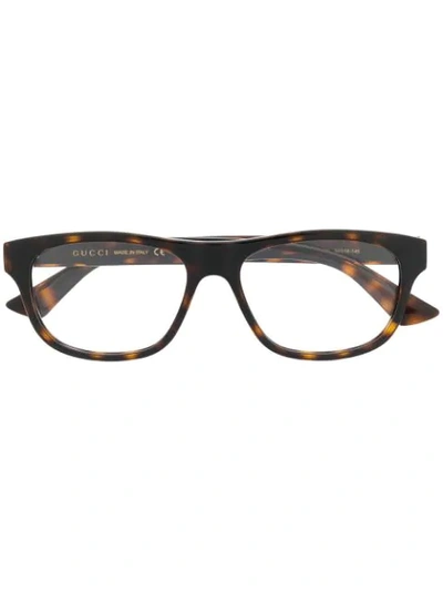 Havana/brown logo plaque rectangular-frame glasses from GUCCI EYEWEAR featuring tortoiseshell, rectangle frame, clear lenses, logo plaque at the arm, signature Web detail, straight arms and curved tips. Don't be short sighted! All glasses from Farfetch are bought as non-prescription frames.. We know you'll look after them, but these glasses come with protection, just in case.