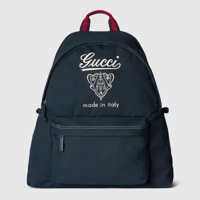 The Spring Summer 2025 men's collection speaks of freedom, energy and community through the latest selection of travel pieces and men's bags fit for new adventures. This canvas backpack with a tonal leather trim and top stitch detailing, features a Gucci Made in Italy crest print across the front. , Dark blue canvas, Blue leather trim , Gucci Made in Italy and crest print, Blue and red Web, Top stitch detailing , Inside: 1 zip pocket, Outside: 1 front zip pocket, Handle drop: 6cm, Zip closure, W42cm x H48cm x D18cm, Weight: 1.28kg approximately, Made in Italy