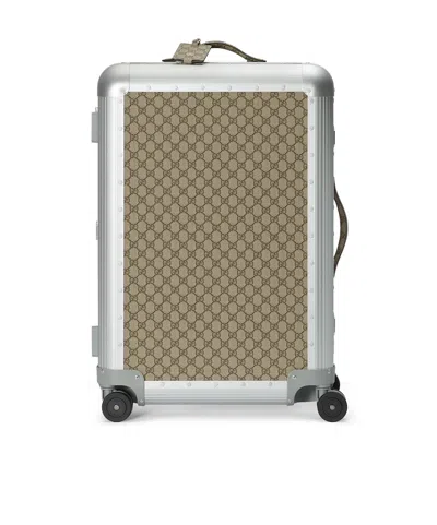 Referencing the House s beginnings in the world of luggage and Guccio Gucci s time at the Savoy Hotel in London travel items continue to evolve to embrace the contemporary This medium trolley is presented in a unique combination of silver aluminum and beige and ebony GG Supreme canvas Beige and ebony GG Supreme canvas Silver aluminum trim Nylon lining Detachable identification tag Four 360 wheels This trolley was created in collaboration with the Italian luxury luggage maker FPM Milano in a continuation of the House s Gucci Valigeria travel narrative Inside 1 compartment with removable GG Supreme panel and two elastic straps with adjustable tuc closure 1 compartment with criss-cross elastic straps and adjustable tuc closure Capacity 68L Retractable and telescopic top handles and one side handle Lock closure with code 17 7 W x 26 8 H x 10 8 D Weight 18 3lbs approximately Made in Italy