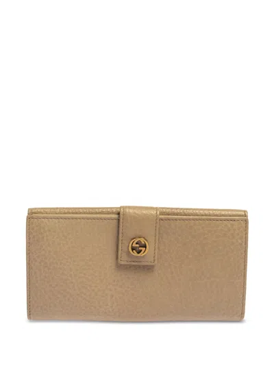 beige leather signature Interlocking G logo foldover top folded design internal card slots internal slip pocket gold-tone hardware Condition: GOOD. This previously owned and used item is in good condition with minimal signs of use. This may include fading of material or plating and scratches.