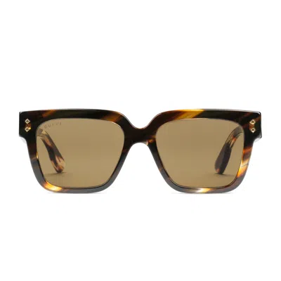These rectangular-frame sunglasses have a timeless appeal. Crafted from tortoiseshell acetate, they are characterised by subtle gold-tone Gucci lettering and rivets detailing on the frame and temples. A brown lens completes the style with a vintage feel. Shiny flamed tortoiseshell acetate frame, Shiny flamed tortoiseshell acetate temples with Gucci logo and rivets, Solid brown lens, 100% UVA/UVB protection, Frame height: 5.15cm, Frame Width: 14.6cm, GG1084S , Temple length: 145mm, Lens height: 42.7mm, Nose bridge length: 18mm, Made in Italy, The glasses will arrive in a velvet case, available in a range of six jewel-toned colours and paired with a coordinating satin lining. The case colour will be individually selected for each pair of glasses and comes with a matching satin flannel pouch and ivory microfibre cloth.